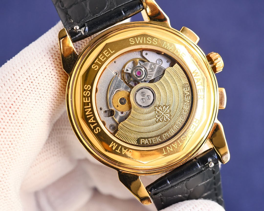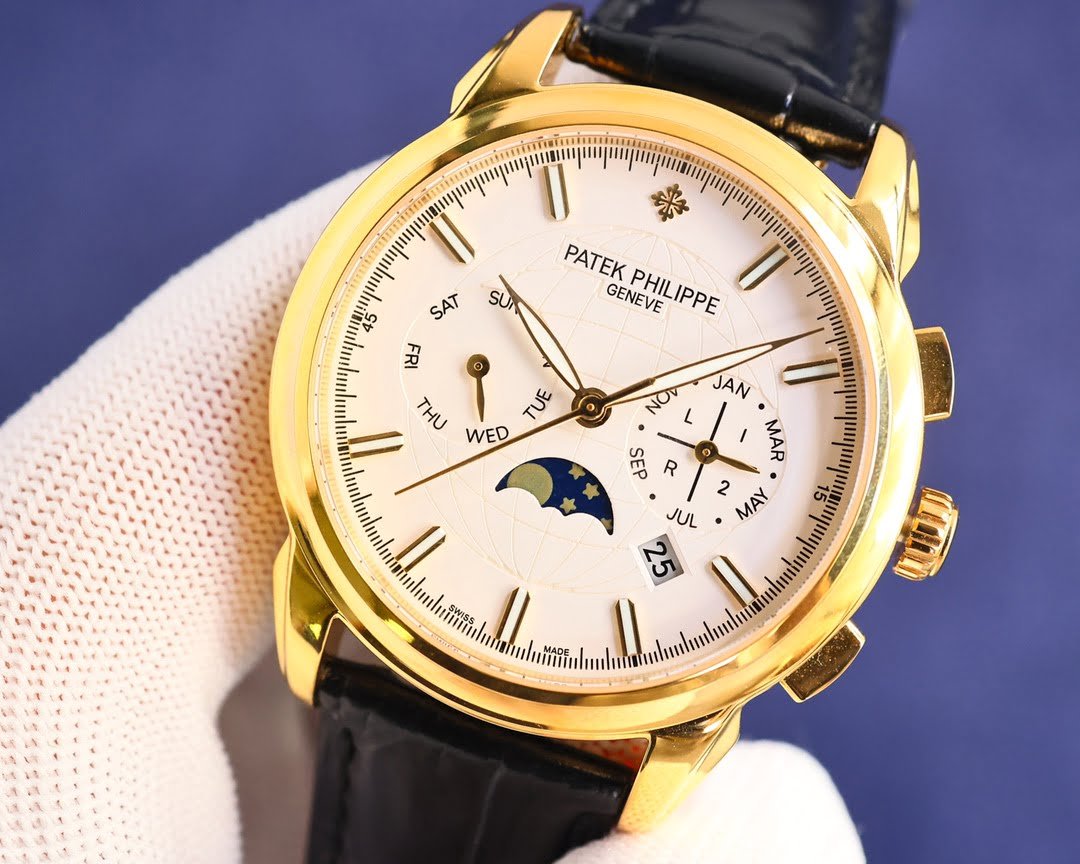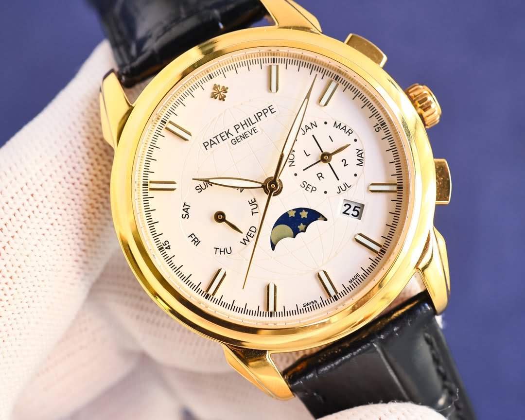 Patek Philippe complex function chronograph series, steel inner cover, earth pattern lettering and high-end inner shadow logo, with imported 9100 multi-function movement (0 repair), function (24 hours, week, star, month), imported 316 stainless steel, 18k quality furnace vacuum plating, Italian imported calfskin, original folding buckle, size 41mm, wear-resistant and scratch-resistant sapphire glass.