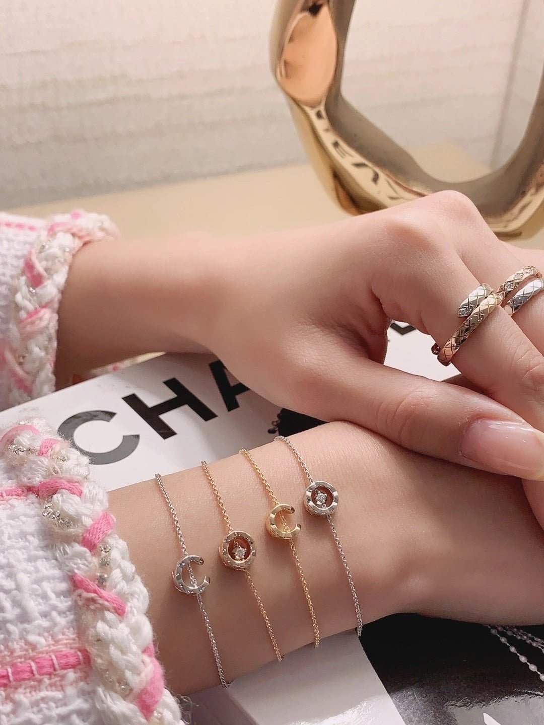 CHANEL COCO CRUSH quilted crescent moon bracelet, fully engraved, V gold material, available in rose gold, gold and silver.