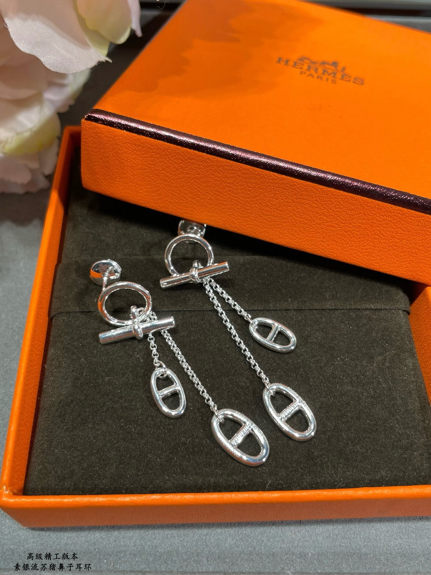 Hermès tassel silver pig nose earrings, advanced precision version, high-end 925 sterling silver gold-plated, k gold texture.
