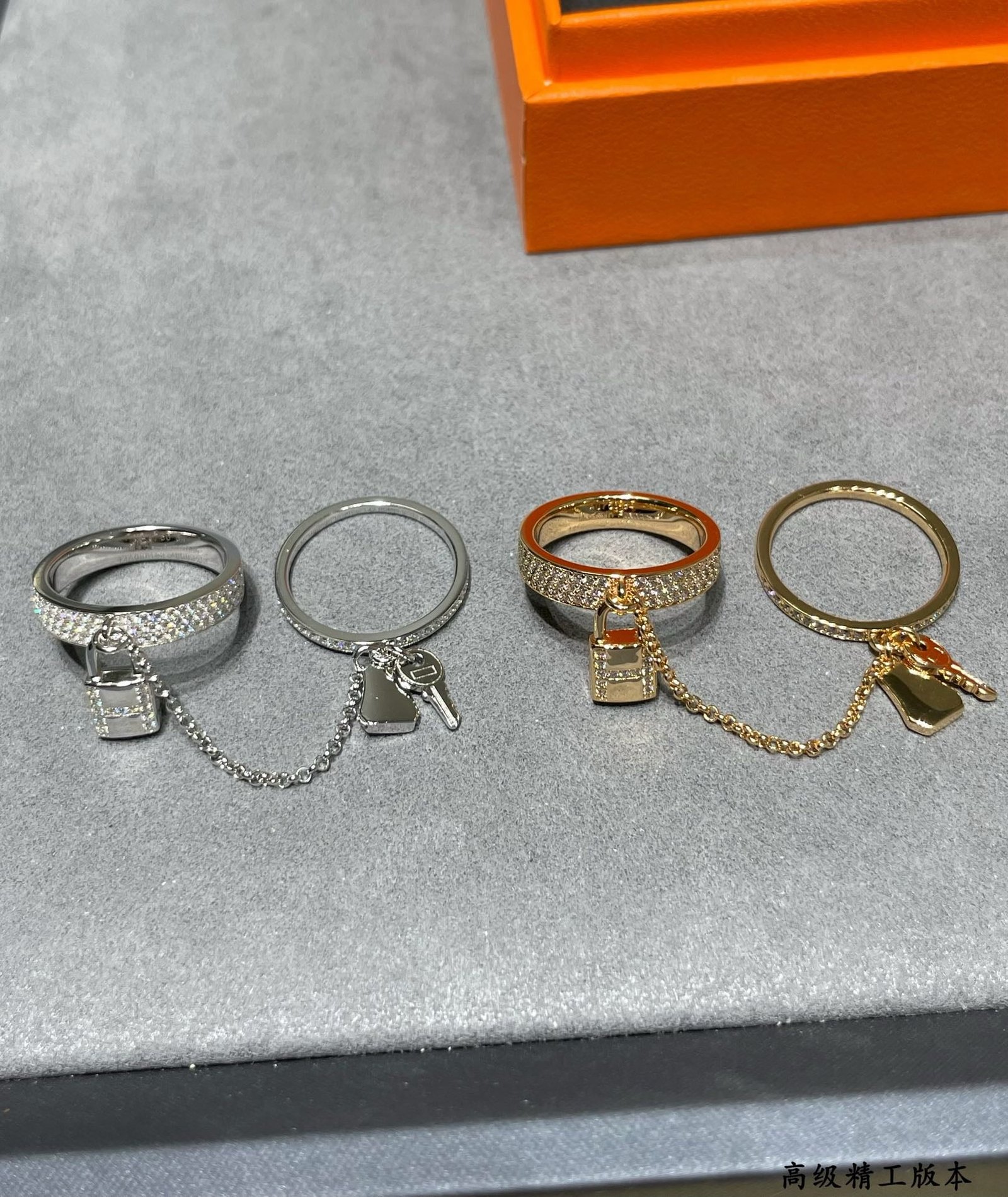 Hermès two-in-one padlock ring, high-carbon diamond, K gold texture, fine inlay, V gold material, detachable chain.